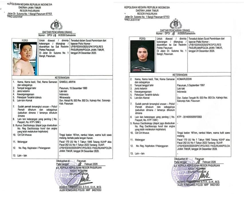 “Lebih baik dua orang DPO tersebut menyerahkan diri dan mengikuti proses hukum di Polres Pasuruan. Karena setelah ditetapkan DPO, seluruh jajaran Kepolisian akan mencari dan menangkapnya,” ujar Dodik, Rabu (18/2/2026).
